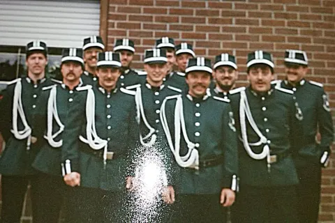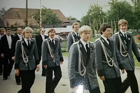 Zu dieser Zeit wurden die Uniformen noch von der Bruderschaft, bei der Firma Hinzen in Korschenbroich geliehen, die Anprobe fand später im Haus der Familie Schnitzler auf der Broicher Straße statt und nahm einige Zeit in Anspruch, bis jeder dann eine passende Uniformjacke gefunden hatte.